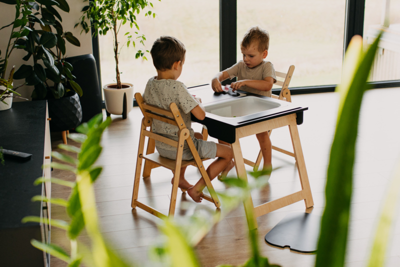 De tafel is gemaakt van stevig hout en heeft een natuurlijk, Scandinavisch design dat prachtig past in elke kinderkamer.
