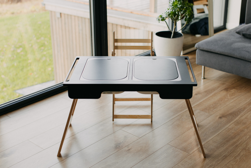 Je kan de tafel eenvoudig inklappen, je schuift hem ruimtebesparend onder de bank of in de kast.